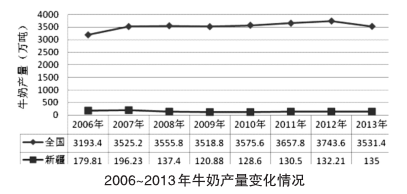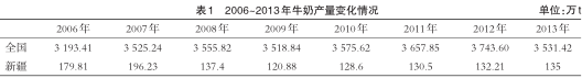我国目前是世界第二大乳制品消费国,人均消费量从30年前不足每年1kg增加到28.3kg,乳品行业成为人民生活的重要产业。2013年内蒙古牛奶产量908万t,居全国之首,新疆牛奶产量135万t,位列全国第7。据统计,2006~2013年新疆牛奶产量由179.81万t降至135万t,近4年来新疆牛奶产量变化幅度相对较小(见表1、图1),目前,新疆饲养的奶牛品种主要有荷斯坦、西门塔尔和新疆褐牛,其中荷斯坦牛77万头、西门塔尔牛54万头、新疆褐牛84万头,占奶牛存栏总数的73%。全区50~1000头养殖场(户、小区)2314个,占全区奶牛总存栏的26%,奶农专业合作组织246个。在经历了2013年下半年的“奶荒”后,全球奶价自2014年3月开始就持续下跌,全球奶源主要供应地新西兰、欧盟的原奶价格跌幅已经达30%~40%。我国鲜奶收购价格在2014年下半年以来也持续下跌,全国生鲜乳主产区平均价格已降至3.75元/kg。