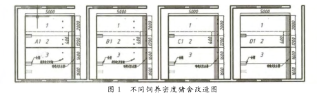 A1、B1、C1、D14个猪舍中实验猪的品种均为荣昌猪仔猪,每个圏栏均为20头,小栏、中栏、大栏密度分别为0.3m2/头、0.4m2/头、0.5m2/头,小栏密度>中栏密度>大栏密度。