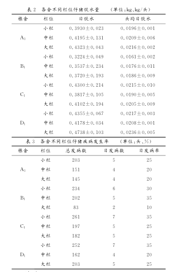 虽然个别猪舍小栏的饮水量较大,但其不稳定。说明在相同饲养密度下大栏中仔猪群体及饲养面积有利于仔猪摄入较多的水。