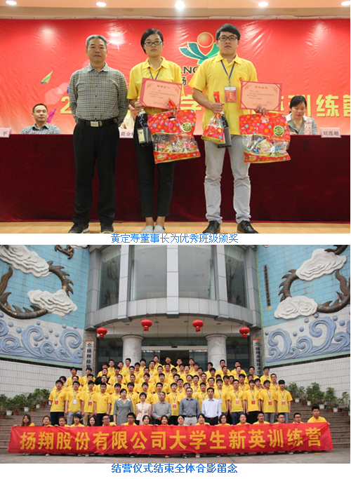 在班级展示环节中,各班级都通过班级口号和班歌等形式充分展现出新英训练营成员们的良好精神面貌和风采。紧接着由公司董事长黄定寿为优秀个人和优秀班级进行颁奖,以此来鼓励各个学员在扬翔未来的道路上继续拼搏,为扬翔的发展贡献出自己的一份力量。