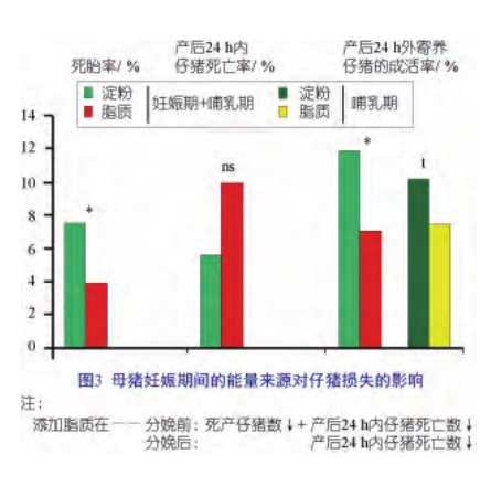 除了这些饲料管理问题,饲料成分也需予以特别关注。母猪采食的日粮将会影响其所产仔猪的体重、活力和健康。Quiniou研究了这个问题,她用淀粉代替脂质作为日粮中的能源,结果发现这种替换不会影响母猪所产仔的窝内同质性,但能提高仔猪的活力和初生重轻的仔猪存活率(图3)。由于活力提高,低初生重仔猪拥有更强的力量来靠近并争夺母猪的乳头以吮吸初乳,这反过来可向它们提供更多的能量,使其对寒冷环境有抵抗力,并能更好地刺激其免疫系统。
