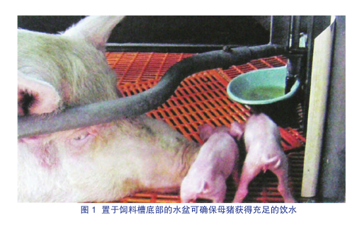 位于饲料槽底部的喷嘴式饮水器也可导致母猪饮水量不足。解决方案包括在饲料槽底部放置一只独立的饮水盆,或在饲料槽顶部安装一个咬式饮水器。先进的湿料装置能够在母猪分娩前后提供更多的饮水(图1)。