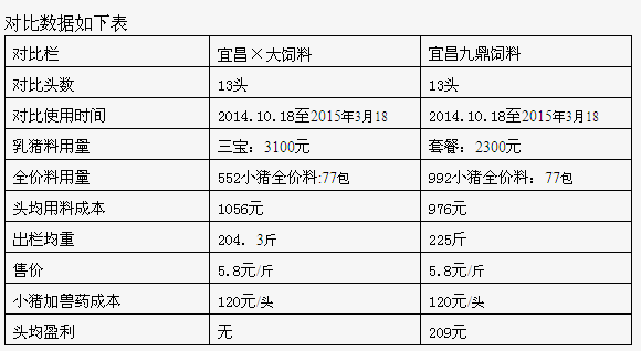 田科凤老板是车家店养殖合作社中的一员,长期存栏育肥猪百头以上,听说九鼎饲料好,而且公司直销可以大大降低饲养成本,就全程使用九鼎饲料,从“6+1”套餐开始到出栏全程均按照九鼎模式,用得比较满意,但是一直没有自己称猪做数据,九鼎饲料的优势也一直没有量化,九鼎饲料好在哪里自己也说不上来。恰好宜昌×大饲料公司业务员三番五次登门拜访,希望田科凤老板使用宜昌×大饲料,但是×大饲料吨价比九鼎饲料贵200元,田科凤老板一直犹豫,最后宜昌×大公司业务员承诺一头猪吃940元饲料保证220斤猪出栏,并同时和九鼎饲料做对比,如果输了补偿差价,因为刚好有两栏小猪,田科凤老板实在不好拒绝,最终同意配合做对比,一栏使用宜昌×大饲料,一栏使用宜昌九鼎饲料,并于2014年10月18日开始对比,2015年3月18日出售,全程5个月九鼎栏均重225斤,宜昌×大栏均重204斤,坚定了田科凤老板忠实使用九鼎饲料的决心,并感言:“宜昌九鼎饲料,真金不怕火炼!”(李海波 宜昌九鼎营销线)