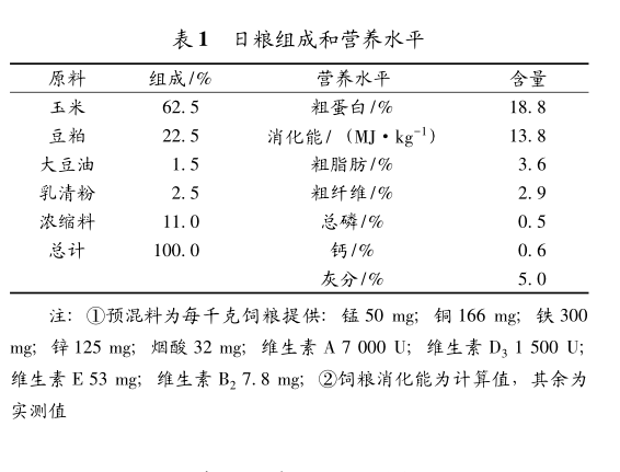 本试验共选用28日龄长白×大白断奶仔猪(体重为5~7kg)180头,按照遗传背景相同、体重接近、公母比例一致的原则随机分成2个处理,每个处理6个重复,每个重复15头仔猪,各处理之间的初始体重差异不显著(P>0.05)。对照组为基础日粮;试验组在基础日粮中添加1%二甲酸钾(商品名为爱康美,纯度>95.6%,二氧化硅≤1.5%。爱德康(大连)环保产品有限公司)。基础日粮不含任何抗生素或酸化剂。预饲期为3d,试验期为14d。试验期间猪自由采食和饮水,按常规免疫程序进行预防接种及消毒驱虫,对于试验期间出现的死猪和僵猪,及时淘汰并称重。日粮组成和营养水平见表1。