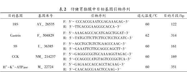 根据GenBank提供的猪gastrin,CCK,SS,H+-K+-ATPase基因cDNA序列分别设计一对特异性引物,引物均由上海生工生物技术有限公司合成。引物参数详见表2。采用18SrRNA作内标,以校正加样和扩增效率的误差。PCR反应体系20μL,包括2μL模板,0.4μL目的基因的前引物,0.4μL目的基因的后引物,10μLSYBRPremixExTaqTM(2×),0.4μLROXReferenceDye(50×),6.8μL灭菌水。PCR反应程序如下:预变性95℃,2min;95℃变性15s,退火30s,72℃延伸30s,进行40个循环;所得的CT值用2-ΔΔCt法[1]统计分析。