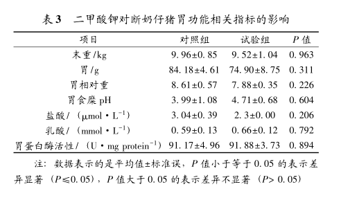 国内外对KDF替代抗生素的研究相对集中在生产性能方面,且结果相似,即KDF可提高猪的生产性能[2-4]。但是二甲酸钾对仔猪胃重及胃功能发育的报道较少。仔猪出生前3周至出生时,胃重基本没有变化。在3~20日龄期间仔猪胃的发育特别缓慢,在30~90日龄期间是胃发育的高峰期,而到90~120日龄期间胃增重开始缓慢[5]。本试验结果表明,饲喂二甲酸钾14d对断奶仔猪胃重和胃相对重没有显著影响。