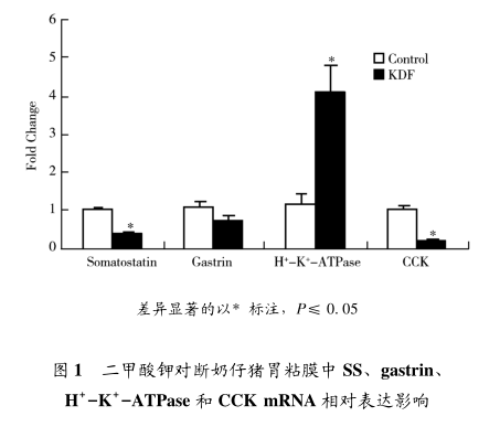 断奶仔猪日粮中添加1%的KDF2周后,能够显著改变胃黏膜中SS、CCK和H+-K+-ATPasemRNA的相对表达水平,提示KDF对胃发育的影响可能是通过影响胃功能相关基因表达而完成,但具体机制还需进一步研究。