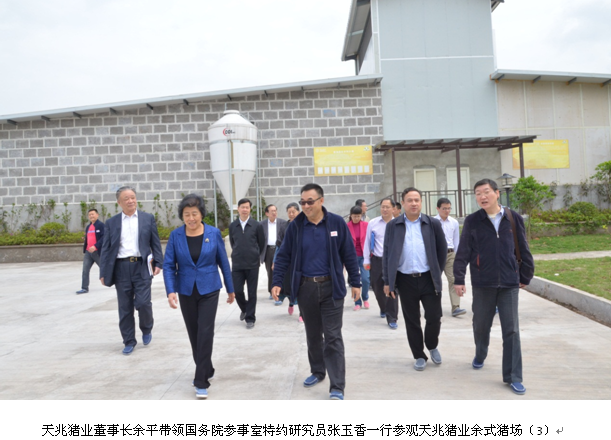 2015年4月10日,国务院参事室特约研究员张玉香一行来到四川省南充市天兆猪业龙池核心种猪场调研。天兆猪业董事长余平陪同张玉香一行实地参观了天兆猪业具有国家创新专利的余式猪场,并作详细的介绍。参观中,张玉香研究员一行对天兆猪业余式猪场产生强烈兴趣,并与天兆猪业董事长余平进行亲切交流。