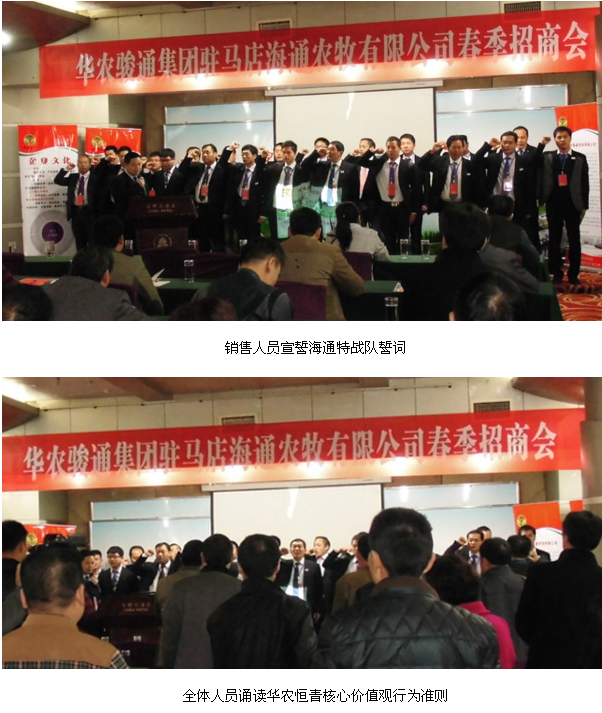 会议由驻马店市海通农牧有限公司销售总经理孔德召主持,以驻马店海通销售人员展示风采拉开序幕。在主持人的带领下驻马店海通的销售精英们喊出“我们是海通特战队,战无不胜,攻无不克!我们只为成功找方法,决不为失败找理由,我们绝不向公司提任何要求! 我们要做的是:第一:执行!第二:完全执行!第三:绝对执行!!!开拓市场,有我最强!!!! ”的海通特战队口号。大家整齐划一、高亢嘹亮的口号不仅喊出了我们销售人员的气势、决心,也感染了到场的所有事业伙伴们。在这之后所有的事业伙伴起立和我们海通人一起高声诵读华农恒青核心价值观行为准则。