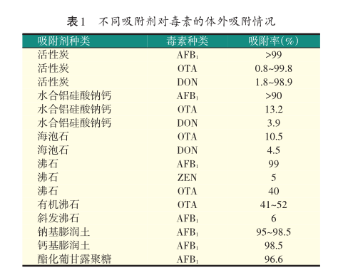 新型无机吸附剂比传统吸附剂有更大的比表面积、孔隙率和离子吸附能力。饲料中添加活性炭(AC)、水合铝硅酸钠钙(HSCAS)、精制沸石等高效吸附剂是一种有效的饲料霉菌毒素脱毒方法[21]。活性炭作为一种高效、无毒的吸附剂,具有很多孔隙结构,其比表面积高达500~3500m2/g[22]Avantaggiato等[23]研究表明,AC可以有效吸附并降低动物肠道中的玉米赤霉烯酮,使用0.25%~2%的AC能够降低肠道吸收43%~84%的玉米赤霉烯酮毒素。HSCAS是一种高效的霉菌毒素吸附剂,使用0.5%的HSCAS即可有效降低尿样中残留的黄曲霉毒素含量[24]。Kabak等[25]研究了不同吸附剂对黄曲霉毒素B1(AFB1)、赭曲霉毒素(OTA)、呕吐毒素(DON)和玉米赤霉烯酮(ZEN)的体外吸附情况,结果如表1所示。
