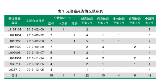 同期猪场的产房死淘率为5.60%,保育死淘率4.90%,生长死淘率1.5%,育肥死淘率1.2%,全期育成率为87.37%。可以看出,无论是哺乳阶段、保育阶段、生长阶段,还是育肥阶段,克隆猪的死淘率均明显高于非克隆猪。
