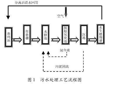 根据污水处理工艺流程,养鸭污水直接泵入细格栅,经细筛网分隔出鸭毛等污物后流入水解池进行大分子水解酸化降解,然后流入生物接触氧化池(设有微孔曝气装置),使小分子有机物进一步降解,达到排放标准,同时完成氨氮硝化,通过混合液回流,使硝态氮在水解池中还原成氮气,降低NH3-N含量,接触氧化池出水经斜板沉淀池泥水分离后清水自流入水生植物塘,经进一步吸附后泵回至养鸭池(详见图1)。