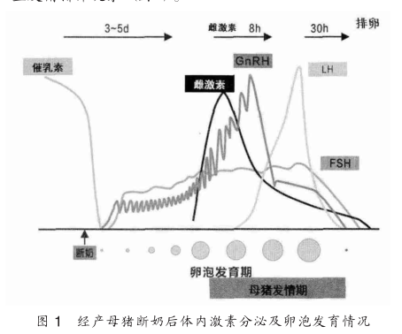 激素水平逐步升高引起。对于后备母猪,随着动物的出生,下丘脑就释放GnRH,但GnRH、FSH和LH的合成与释放对性腺类固醇类激素的负反馈极为敏感,结果达成一种维持性器官发育的低激素水平。随着母畜的体成熟和性成熟,GnRH、FSH和LH的合成和释放对性腺类固醇类激素的负反馈敏感性逐渐降低,同时垂体对GnRH的敏感性逐步提高,形成高水平的激素平衡,即形成后备母畜的初情期。对于经产母猪,哺乳期间高浓度的催乳素抑制了下丘脑GnRH的释放,哺乳期间不发情,断奶后,由于没有了仔猪对乳头及乳房的强烈刺激催乳素浓度迅速下降,解除了对下丘脑GnRH释放的抑制作用,下丘脑开始有节律地释放GnRH,GnRH促进垂体前叶释放FSH—卵泡发育—成熟—产生的雌激素形成发情现象,同时雌激素促进GnRH-LH峰的形成,产生发情排卵现象(图1)。