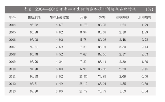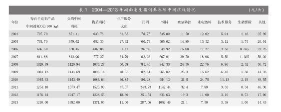 生猪饲养中间消耗是指生猪生产过程中所消耗的货物和服务的价值,包括物质产品消耗和非物质性服务消耗。物质产品消耗包括用种量、饲料、燃料、养殖用药、用水用电量消耗等;非物质性服务消耗包括生猪配种费、防疫费、保险费等。生猪饲养的中间消耗越多,所得到的增加值越少。降低生猪生产的中间消耗,就是提高生猪生产的增加值,提高生猪生产的效率。本文根据2004—2013年《湖南省调查资料》(国家统计局湖南省调查总队编辑)的生猪中间消耗数据,将其上半年中间消耗和下半年中间消耗的平均值作为当年的生猪饲养中间消耗,并以此为基准分析湖南省生猪饲养中间消耗的变化趋势。