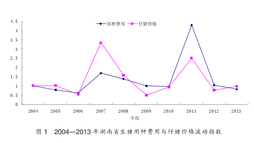 用种费用主要由购入仔猪的数量、重量、价格和购入种猪的数量、价格等因素共同决定。从图1可以看出,生猪用种费用变化与仔猪价格变化具有明显的相关性,但是二者波动幅度变化较大,既可能是仔猪价格波动幅度大于生猪用种费用波动,也可能是生猪用种费用波动幅度大于仔猪价格波动幅度。如2007年,仔猪价格波动指数为3.33,而生猪用种费用的波动指数为1.69,表现在二者的价格波动变化是,仔猪价格、生猪用种费用分别下跌0.98元/kg、64.54元/头。2011年则是仔猪价格的波动指数为2.5,生猪用种费用波动指数为4.28;表现在二者的波动价格变化是,仔猪价格和生猪用种费用分别上涨25.87元/kg、262.72元/头。甚至有个别年份出现小幅反向波动情况,如2012年仔猪价格波动指数为0.76,而生猪用种费用波动指数为1.02(图1);表现在二者价格波动变化是,仔猪价格下跌10.54元/kg,生猪用种费用上涨7.81元/头;这主要是由于仔猪价格下跌时,仔猪养殖户推迟仔猪出售时间,造成生猪养殖户购入的仔猪因增加重量而费用增加。同时,由于母猪最经济的饲养年限为3~4年,即母猪每3~4年就需要更新淘汰,遇上种猪更新或扩群时,生猪的用种费用增加明显。