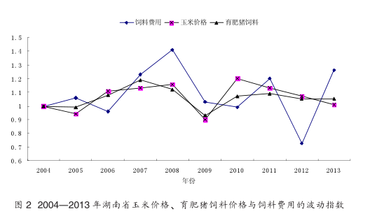 二是饲料费用波动幅度相对较小,其波动指数最大值(2008年为1.41)与最小值(2012年为0.73)相差0.68。相邻两年年际间的最大波动指数变化值为0.53(2013年),最小波动值为0.04(2010年),平均年际间的波动幅度为0.25(图2)。饲料费用波动与玉米价格波动形成这两个明显特点的主要原因是生猪生产过程中单位猪只的饲料消耗呈固定态势,而养殖户购买的饲料一般要使用一个月左右,这个饲料使用期就是玉米价格波动的延后期。因此,养殖户饲料费用的波动变化往往较玉米价格波动滞后一段时间。