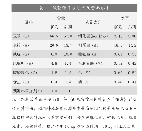 饲料配方及营养水平见表1,分前、后两期,以组内平均体重达60kg为界限,60kg以下为前期,60kg以上为后期,到180日龄平均体重达到100kg时试验结束。饲喂干粉料,日喂三次,自由采食,自动饮水。每日两次清扫猪舍,保持舍内干净卫生。采取“清箱底”法计算耗料,每日做好饲料记录及猪群生长发育情况,发现异常及时处理。