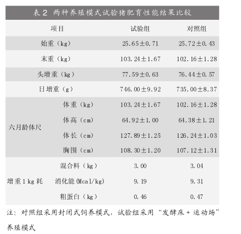 两种养殖模式试验猪肥育性能结果见表2,从表中可以看出,“发酵床+运动场”养殖模式猪只日增重比封闭式饲养模式提高了1.5%。而两种饲养模式对体尺和单位增重耗料没有影响。