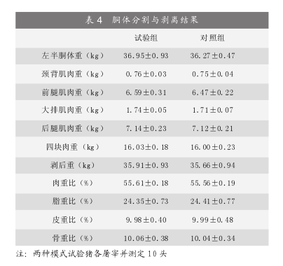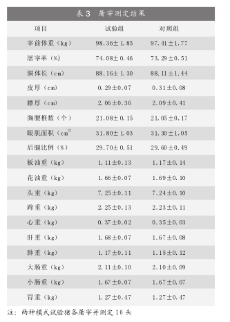 表3为屠宰测定结果,从表中可以看出,两种养殖模式对里岔黑猪的屠宰性能无影响。