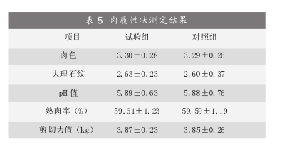 试验组和对照组各随机选择10头猪只于180日龄进行屠宰,进行屠宰性能测定。胴体性状测定空腹体重、胴体重、胴体长、背部膘厚、眼肌面积、后腿比例及左半胴体肉、脂、皮、骨的百分率;肉质性状测定pH值、熟肉率、嫩度、肉色及大理石纹评分;其评定方法为:肉色、大理石纹采用评分标准图评定;肉的酸碱度测定采用上海雷磁仪器厂生产的PHB-29型酸度计测定,熟肉率评定采用腰大肌,用感应量为0.1g的天平称重,隔水煮45分钟,取出冷却30分钟后再称重,计算熟肉率;肉嫩度评定,采用东北农学院研制的C-LM型肌肉嫩度计,以剪切力值测定法评定肌肉嫩度。