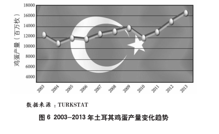 在欧盟内部,2000年至2012年鸡蛋总产量增加了6.3%。Windhorst的报告显示欧盟鸡蛋生产的相对恢复主要归功于某些东欧国家的发展。例如土耳其鸡蛋产量已有显著增长。自鸡蛋产量从2009年的138亿枚降至2010年的118亿枚以来,土耳其鸡蛋产量已经平稳恢复至2013年的165亿枚,这是一个空前高速发展的10年(图6)。总的来看,欧盟东部国家经历了绝对和相对均为最高的增速,欧盟北部和南部地区也在扩大生产,而欧盟西部地区却出现了下降,因其在同一时期鸡蛋产量下降了9.3%。