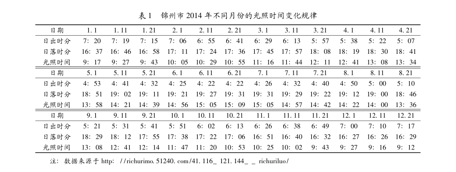 锦州市地处北纬41°116',东经121°144',经查阅有关资料汇总出2014年锦州市不同季节的每日光照时间(见表1)。