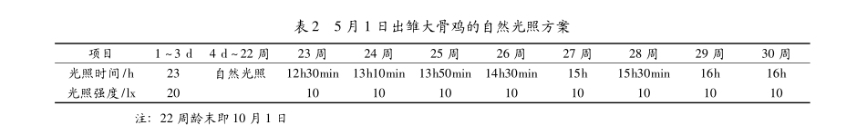 在4月上旬至7月下旬出雏,育成期全部或较长时期处于自然光照时间渐减阶段,自然光照时间与生产所需光照基本一致,一般称为顺季光照。处于顺季光照的鸡群,通常采用自然光照法。自然光照法,即育雏-育成期充分利用自然光照,性成熟后可逐渐增加光照时间至16h以后维持不变。应用此种光照方法时,其生殖器官快速发育时期正值自然光照时间呈逐渐递减期间,这种光照时间逐渐递减变化具有抑制家禽生殖器官发育的作用,所以,性成熟后开始增加光照时间时,其增加梯度应适当大一些,以促进生殖器官发育,确保生殖器官、体重、体尺生长发育协调。如5月1日出雏大骨鸡,其光照方案见表2。