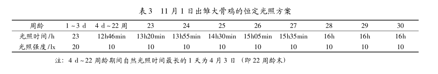 在8月上旬至来年3月底出雏,育成期全期或较长时间处于日照时间渐增阶段,自然光照时间与生产所需光照不一致,一般称为逆季光照。处于逆季光照的鸡群需要人工补充光照来满足鸡的光照需求,通常采用恒定光照法和渐减光照法。恒定光照法一般适用于8月上旬至冬至期间出雏的鸡,其自然光照时间逐渐减少并维持较短时间,这种自然光照变化可抑制鸡的性腺发育,而通过增加人工补充光照,采用恒定光照法可减轻这种抑制作用。其光照制度一般为:1~3d,光照时间为23h,光照强度为20lx;查出其育成期当地自然光照时间最长1天的光照时间,自4日龄起即给予这一光照时间,并保持不变至自然光照时间最长1d时为止,此期内自然光照时间不足时,人工补充光照,光照强度为10lx;性成熟后逐渐增加光照时间至16h以后维持不变。如11月1日出雏雏鸡,其光照方案见表3。