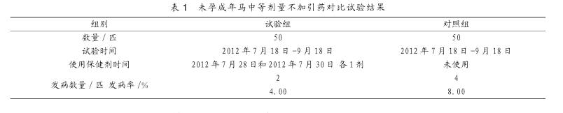 2.1.4分析 分析表1可以看出,试验组马匹发病率为4.0%,比对照组的8.0%发病率下降4个百分点,经生物统计分析,差异显著(P<0.05)。