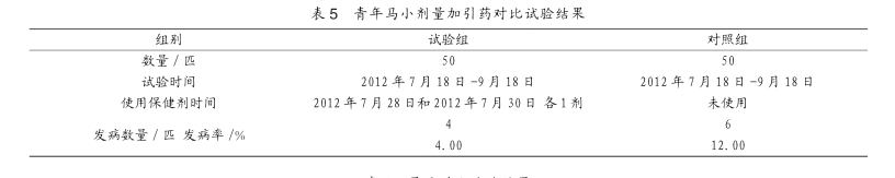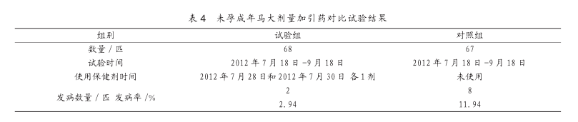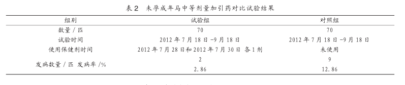 2.2.5分析分析表2可以看出,试验组马匹发病率为2.86%,比对照组的11.42%发病率下降10.00个百分点,经生物统计分析,差异极显著(P<0.01)。