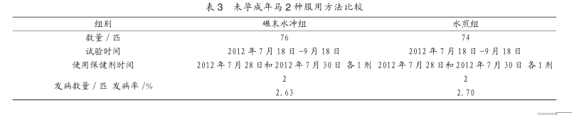 2.3.5分析通过表3的试验数据显示,未孕成年马2种使用该保健剂的方法中,碾末水冲组发病率为2.63%,水煎组发病率为2.70%,差异不显著(P>0.05)。