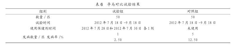 2.6.5分析 分析表6可以看出,试验组马匹发病率为2.50%,比对照组的12.50%发病率下降10.00个百分点,经生物统计分析,差异极显著(P<0.01)。