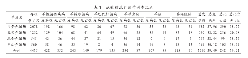 2012年,笔者对4个规模羊场进行了流行病学调查,结果显示,最主要的疫病是羊梭菌性疾病、羊链球菌病、羊巴氏杆菌病、羊原虫病和羊痘。综合发病率为29.49%,死亡率为19.21%。调查结果见表1。
