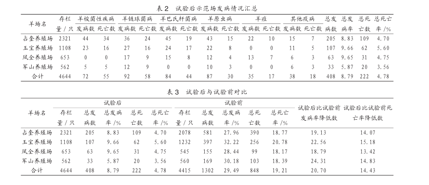 项目组对试验后4个养殖场主要羊病的发病、死亡情况进行汇总,同时与试验前进行对比分析,具体结果见表2、表3。