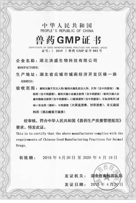 上月,回盛股份旗下子公司湖北泱盛生物科技有限公司(简称“泱盛生物”)顺利通过农业部专家组的GMP现场检查验收。4月21日,湖北省畜牧兽医局向泱盛生物颁发了《兽药GMP证书》及《兽药生产许可证》。