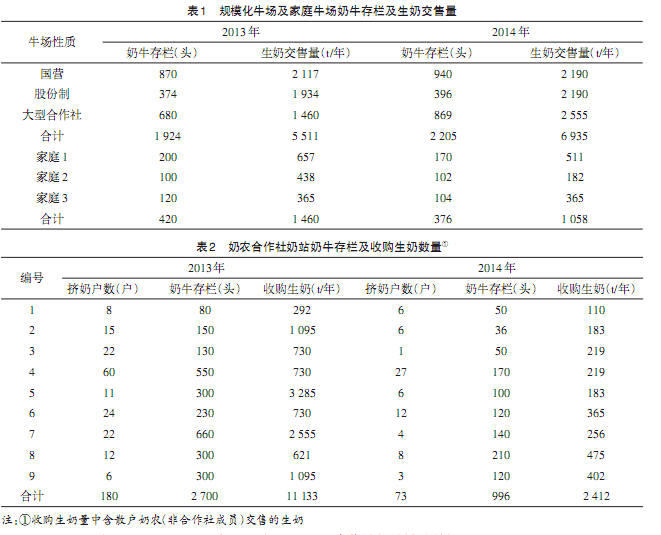 调查了3家规模化牛场(其中1家为大型合作社的规模化牛场)和3个家庭牛场。2014年和2013年相比,规模化牛场的奶牛存栏增长14.6%,生奶交售量增加25.8%;家庭牛场的奶牛存栏减少10.5%,生奶交售量下降27.5%。见表1。