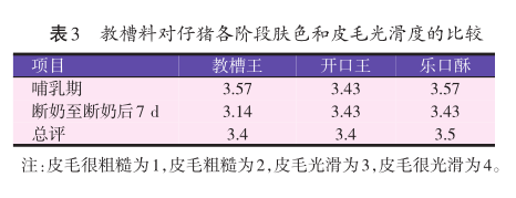 2.5 不同教槽料对仔猪肤色和毛皮光滑度的影响(见表3)