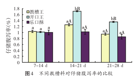 7~14 d, 仔猪腹泻率差异都不显著(P>0.05)。14~21 d, 开口王的腹泻率极显著高于另外两组(P<0.01),教槽王的腹泻率比乐口酥高(P>0.05)。21~28 d, 开口王与其它两种饲料的腹泻率有极显著差异 (P<0.01) ,教槽王和乐口酥的腹泻率差异不明显 (P>0.05) 。