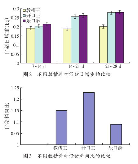 采食量与日增重相联系, 若仔猪采食量大, 但日增重却很小, 那么, 这种教槽料也是不能采用的。图2是三种不同教槽料对仔猪日增重的分析。