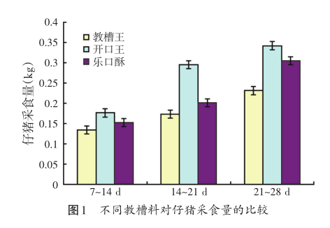 从日增重来看, 乐口酥和开口王的饲喂效果明显好于教槽王, 甚至在14~21 d阶段饲喂教槽王的仔猪日增重还有下跌趋势, 尽管乐口酥的采食量没有开口王大, 但是日增重超过了开口王。