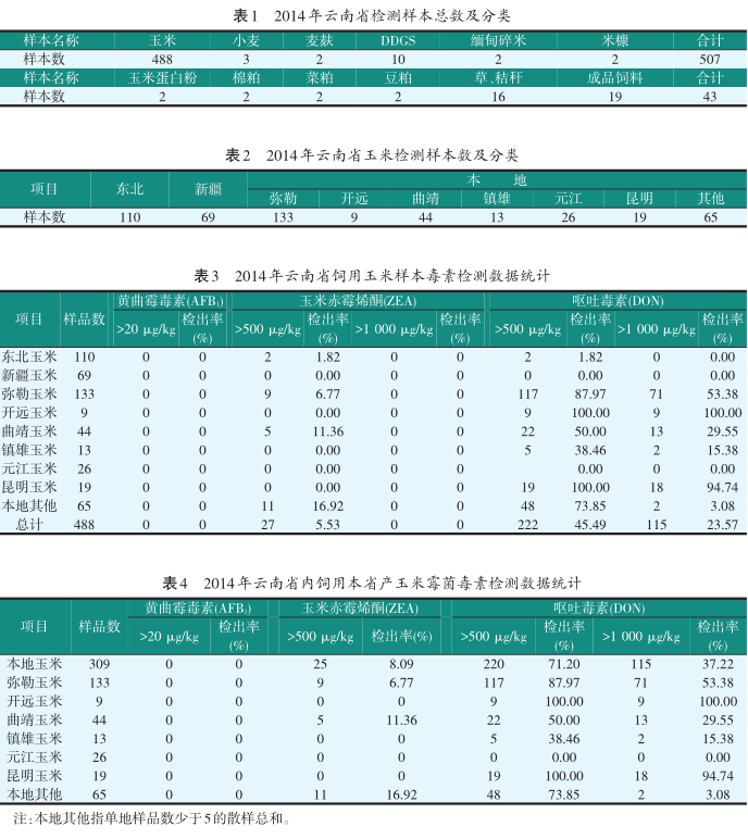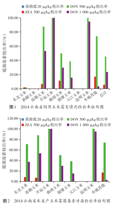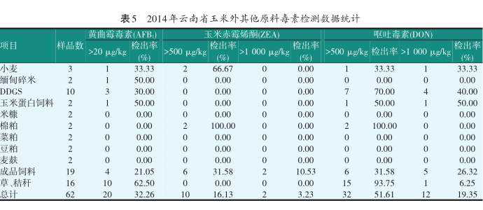 ① 玉米总体这几年黄曲霉毒素 B1(AFB1) 超20 μg/kg 的检出率在下降, 但是呕吐毒素 (DON) 超500 μg/kg近一半, 其中云南本地玉米更是高达70%以上的检出率, 1 000 μg/kg以上的也高达近40%检出率, 说明云南当地玉米在呕吐毒素 (DON) 上应该严加把关。