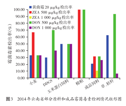 由云南省畜牧兽医科学院营养实验室、禾丰集团、上海澳灵生物科技有限公司相关技术人员,对云南省内部分饲料原料及饲料中霉菌毒素的污染程度开展了较大范围的样本采集及数据分析;各种原料、饲料成品由云南省内饲料企业、原料供应商配合提供,畜牧所研究人员现场采集所得;检测工具主要由上海澳灵生物科技有限公司生产的霉菌毒素现场快速检测卡以及国产试剂盒; 检测方法采用金标试纸法;检测指标由禾丰集团技术部、云南省畜科院、上海澳灵生物科技有限公司、云南省内饲料企业结合国标