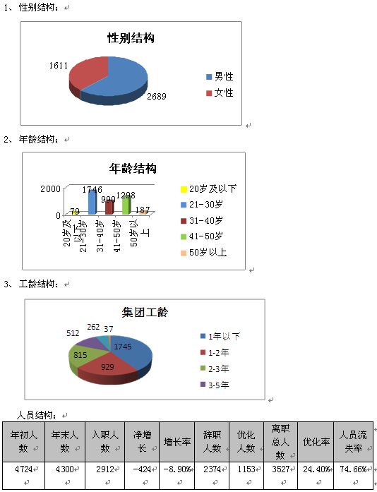 首先通过对集团的人力资源整体现状进行分析,发现企业在过去的几年里离职率都居高不下。以013年为例,集团年度人员离职率接近100%。俗话说家有一老如有一宝,我们一方面在考虑如何留人(如养殖系统的金色蓝领计划),一方面却又简单的通过年龄、性别、学历等因素的不合适来进行人员替换,最后企业付出了大量的用人成本,却没有换来相应的业绩,更没有换来员工的口碑与忠诚。大量老员工的离职,也意味着熟练劳动力的丧失,而熟练劳动力应该说是企业人力资源的最核心资源和竞争力。通过对工龄和年龄的分析,3年以上的熟练员工人数在全集团的占比不到20%,如果除去职能系统的相对稳定性而留下的人员,营销系统和生产系统的熟练员工占比令人堪忧。营销体系长期的大面积更换,表面上反映出的是销售人员能力不合格,深层次反映的则是企业的营销模式和营销策略存在问题,如果三军出征皆战死,那肯定是将的问题或者是策略的问题;而生产体系人员的大幅流失,一方面反映出车间的劳动强度大、员工对工作满意度低,另一方面也反映出车间管理水平不高,在留人方面毫无办法。企业老员工就是企业的活口碑,雇主品牌的建立应该首先是有很多人在企业上班,又有很多人想来企业上班。