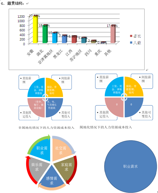 若集团长期健康发展,就应该坚定不移的坚持并加大属地化招聘及用工。例如集团总部位于天津地区,未来伴随着企业发展,天津地区的企业规模应该会进一步增大,那么对天津地区的人员招聘力度就需要相应加大。属地化用人的优势可以体现在以下几个方面:1、可以降低公司的人力资源成本投入。人力资源成本不但包含直接薪酬,还包含间接薪酬,甚至还有非薪酬但必须投入部分,而这些项目的投入实际的费用占比是很大的,如果将此部分的投入下降甚至没有的话,那么可以为企业节约大批的资金和运营成本,从而更好的为企业经营服务(如上图显示)。2、可以满足人的社会属性,人的社会属性包含着诸多方面(如社交和家庭的需求,感情的需求等),在各种需求得到满足的情况下,人的满意度自然会提升,因为日常工作带来的压力和心力疲惫自然可以降低,从而可以一定程度上提升员工对企业的满意度,降低人员流失率。