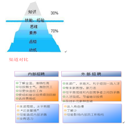 量才招聘,适度招聘,招聘最合适的人,而不是招聘最优秀的人。错误的时间遇到错的人是不合适的,但是错误的时间遇到对的人,对的时间遇到错误的人同样也是不合适的。招聘就应该追求在正确的时间遇到对的人,这样才能最大限度的发挥人才的价值,实现企业利润的最大化。比方说,我们招聘中找到一个大字不识的人来做管理者是不合适的,但如果我们招聘了国家领导人来做公司管理者同样也是不合适的。招聘人才时,不能仅局限于对技能和知识的考察,而应从应聘者的求职动机、个人品质、价值观、自我认知和角色定位等方面进行综合考虑。如果没有良好的求职动机、品质、价值观等相关素质的支撑,能力越强、知识越全面,对企业的负面影响会越大。根据冰山模型,素质可以概括为以下7个层级: