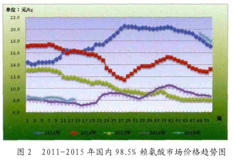 今年一季度以来, 国内赖氨酸市场整体呈现弱势震荡局面。和往年情形相反, 2015 年春节, 国内多数终端饲料厂并没有对赖氨酸进行批量备货, 采购积极性极差。 春节过后国内生猪市场价格依旧以下跌为主, 国内养殖效益的亏损态势较节前有所扩大, 因此国内赖氨酸市场依旧清淡。随着需求面的疲软,对赖氨酸市场信心无疑形成一定的打击, 使得其价格逐步走弱。为了刺激消费, 3 月中下旬国内赖氨酸厂家再次下调出厂报价, 这也成为市场价格跟盘走弱的最直接因素。 据了解, 针对战略客户,部分厂家对 98. 5% 赖氨酸的报价低于 8 元 /公斤,基本临近 2014 年赖氨酸的价格低点,这也吸引了部分市场用户签单活跃, 3 月底, 随着厂家签单量的增多, 厂家开始恢复之前的报价, 分别将 98. 5% 和70% 赖氨酸的报价提至 8. 1 元 /公斤和 5. 2 元 /公斤 (图 2 ) 。