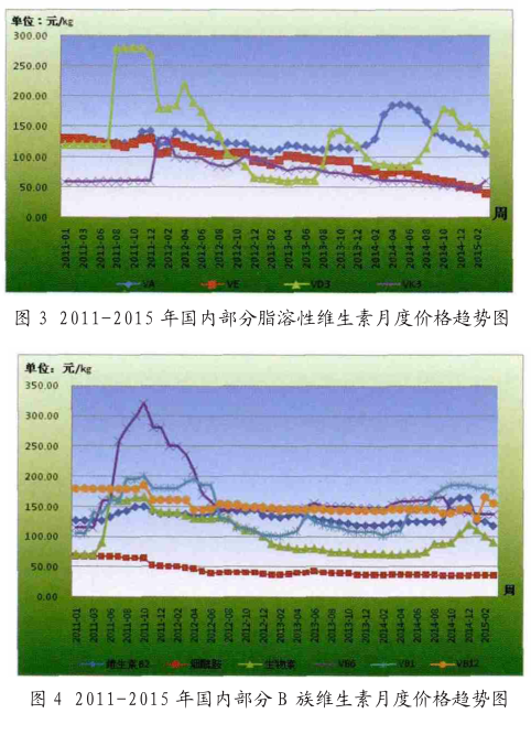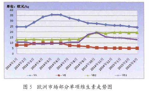 2015 年 1-2 月份, 国内单项维生素除叶酸外,几乎所有的品种都呈现弱势 (图 3、 4 ) , 进入 3 月份,国内部分维生素厂家有停报或提价行为, 市场关注度虽有所提升,但实际市场成交形势依旧不容乐观。维生素用量较大的 VA 和 VE 其价格一直延续弱势, 截止 3 月底, 国内进口 /国产 VE 的大客户成交价已低至 40 元 /公斤,已经低于 2007 年的最低价位; VA 的大客户成交价为 102 元 /公斤, 处于历史较低水平, 这主要是因为部分厂家存在高报低走的情况, 市场实际供应量也并非传言般紧缺, 难以对实际行情有所提振。