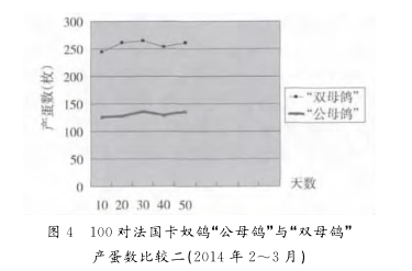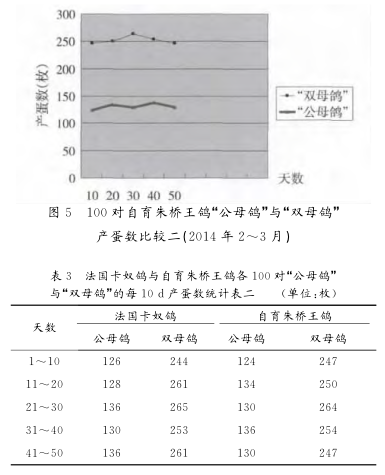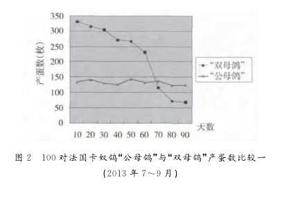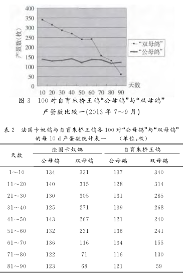 法国卡奴鸽“ 双母鸽”月平均产蛋数分别为9.59、7.58、2.55枚,“公母鸽”月平均产蛋数分别为4、3.97、3.81枚。自育朱桥王鸽“双母鸽”月平均产蛋数分别为9.46、7.46、3.44枚,“公母鸽”月平均产蛋数分别为3.97、4.01、3.71枚。成功配对后第1个月产蛋数相当高,第2个月产蛋数开始有所下降,第3个月产蛋数下降严重, 部分蛋鸽甚至停止产蛋。客观因素:试验时间为7、8、9月份3个月,7月、8月是肉鸽繁殖高峰期,温度高、自然光照时间长对产蛋数产生有利条件;而9月部分鸽子开始换羽,略有影响产蛋。详见图2、图3、表2。
