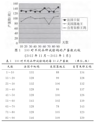 法国卡奴鸽月平均产蛋数分别为3.91、3.98、3.97枚; 美国落地王月平均产蛋数分别为3.03、3.07、2.98枚; 自育朱桥王鸽月平均产蛋数分别为3.94、3.99、4枚; 丹麦皇鸽因为群体数少, 未做试验。经过3个月的生产性能比较, 选择了产蛋数相对多的法国卡奴鸽和自育朱桥王鸽作为商品蛋鸽种鸽群。详见图1、 表1。