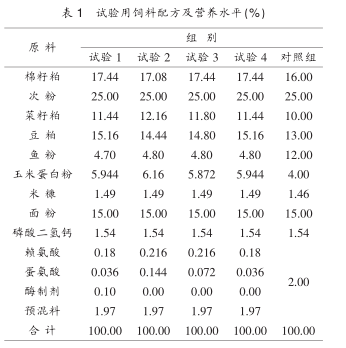 试验用饲料配方及营养水平见表1。饲料制成沉性颗粒,放置在阴凉干燥处备用。